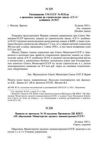 Выписка из протокола № 10 заседания Президиума ЦК КПСС «Об образовании Министерства среднего машиностроения СССР». 26 июня 1953 г. // АП РФ. Ф. 3, оп. 47, д. 13, л. 1. Копия.