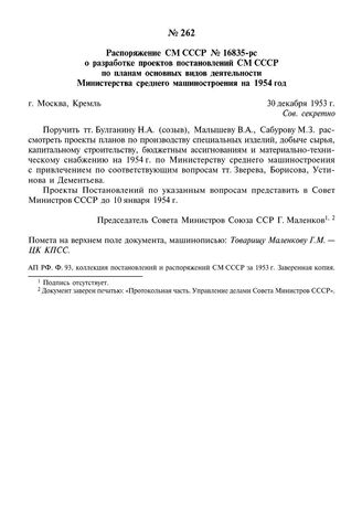 Распоряжение СМ СССР № 16835-рс о разработке проектов постановлений СМ СССР по планам основных видов деятельности Министерства среднего машиностроения на 1954 год. 30 декабря 1953 г. // АП РФ. Ф. 93, коллекция постановлений и распоряжений СМ СССР за 1953 г. Заверенная копия.