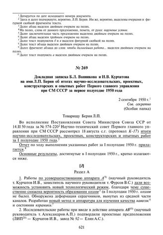 Докладная записка Б.Л. Ванникова и И.В. Курчатова на имя Л.П. Берия об итогах научно-исследовательских, проектных, конструкторских и опытных работ Первого главного управления при СМ СССР за первое полугодие 1950 года. 2 сентября 1950 г. // АП РФ. Ф. 93, д. 205/51, л. 136-145. Подлинник.