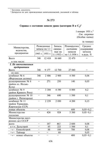 Справка о состоянии запасов урана (категории В и C). 1 января 1951 г.