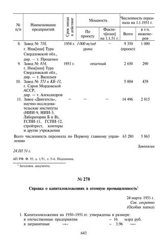 Справка о капиталовложениях в атомную промышленность. 24 марта 1951 г. // АП РФ. Ф. 93, д. 1/51, л. 8-11. Подлинник.