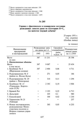 Справка о фактическом и планируемом состоянии разведанных запасов урана по категориям В+С (за вычетом текущей добычи). 25 марта 1951 г.