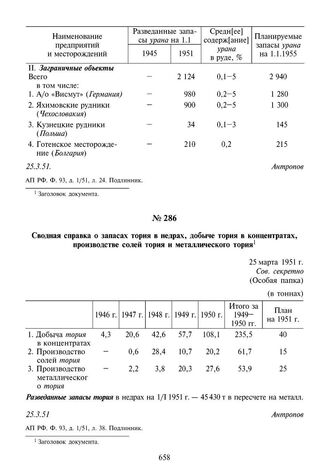 Сводная справка о запасах тория в недрах, добыче тория в концентратах, производстве солей тория и металлического тория. 25 марта 1951 г. // АП РФ. Ф. 93, д. 1/51, л. 38. Подлинник.