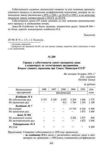 Справка о себестоимости одного килограмма урана в концентрате по отечественным предприятиям Второго главного управления при Совете Министров СССР. Не позднее 26 марта 1951 г.