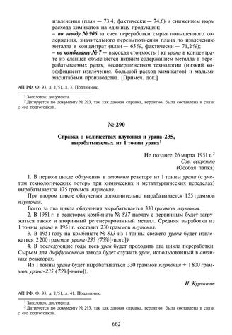 Справка о количествах плутония и урана-235, вырабатываемых из 1 тонны урана. Не позднее 26 марта 1951 г. // АП РФ. Ф. 93, д. 1/51, л. 41. Подлинник.