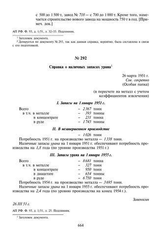 Справка о наличных запасах урана. 26 марта 1951 г.