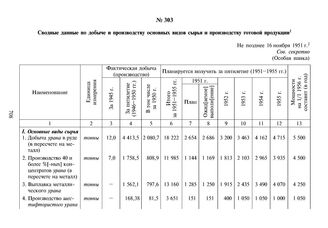 Сводные данные по добыче и производству основных видов сырья и производству готовой продукции. Не позднее 16 ноября 1951 г.