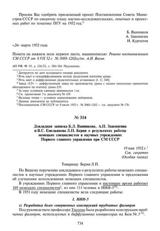 Докладная записка Б.Л. Ванникова, А.П. Завенягина и В.С. Емельянова Л.П. Берия о результатах работы немецких специалистов в научных учреждениях Первого главного управления при СМ СССР. 19 мая 1952 г.