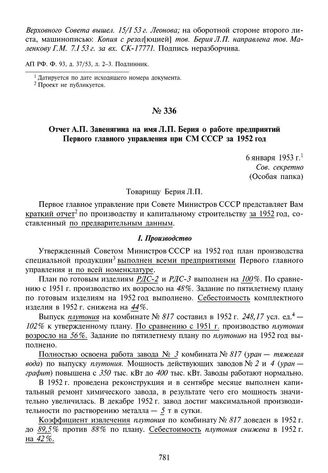 Отчет А.П. Завенягина на имя Л.П. Берия о работе предприятий Первого главного управления при СМ СССР за 1952 год. 6 января 1953 г. // АП РФ. Ф. 93, д. 28/52, л. 308-314. Подлинник.