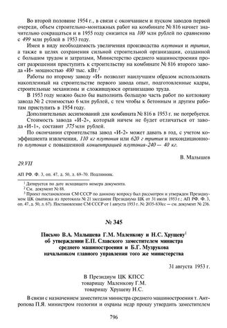 Письмо В.А. Малышева Г.М. Маленкову и Н.С. Хрущеву об утверждении Е.П. Славского заместителем министра среднего машиностроения и Б.Г. Музрукова начальником главного управления того же министерства. 31 августа 1953 г. // АП РФ. Ф. 3, оп. 47, д. 16, л. 52-54. Подлинник.