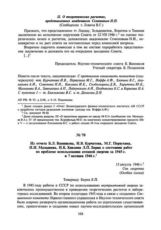 Из отчета Б.Л. Ванникова, И.В. Курчатова, М.Г. Первухина, И.И. Малышева, И.К. Кикоина Л.П. Берия о состоянии работ по проблеме использования атомной энергии за 1945 г. и 7 месяцев 1946 г. 15 августа 1946 г.