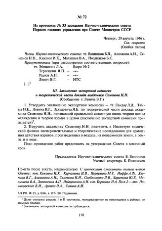 Из протокола № 33 заседания Научно-технического совета Первого главного управления при Совете Министров СССР. 29 августа 1946 г.