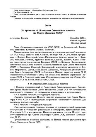 Из протокола № 28 заседания Специального комитета при Совете Министров СССР. 11 ноября 1946 г. // АП РФ. Ф. 93, д. 2/46, л. 187-193. Подлинник.