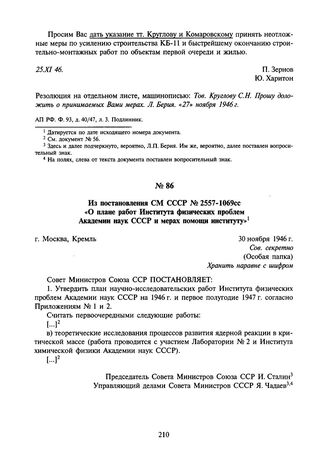 Из постановления СМ СССР № 2557-1069сс «О плане работ Института физических проблем Академии наук СССР и мерах помощи институту». 30 ноября 1946 г. // АП РФ. Ф. 93, коллекция постановлений и распоряжений СМ СССР за 1946 г. Заверенная копия.