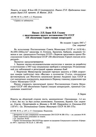 Письмо Л.П. Берия И.В. Сталину с представлением проекта постановления СМ СССР «Об обеспечении Горной станции аппаратурой». Не позднее 1 марта 1947 г. // АП РФ. Ф. 93, д. 1/47, л. 17. Стенограмма. Подлинник.