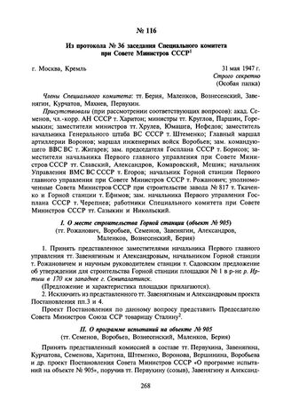 Из протокола № 36 заседания Специального комитета при Совете Министров СССР. 31 мая 1947 г. // АП РФ. Ф. 93, д. 2/47, л. 49-71. Подлинник.