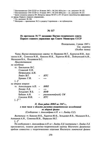Из протокола № 77 заседания Научно-технического совета Первого главного управления при Совете Министров СССР. 2 июня 1947 г.