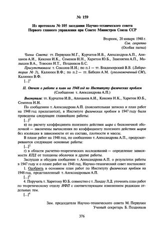Из протокола № 105 заседания Научно-технического совета Первого главного управления при Совете Министров Союза ССР. 20 января 1948 г.