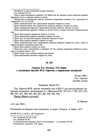 Записка В.А. Махнева Л.П. Берия с изложением просьбы Ю.Б. Харитона о направлении материалов. 26 мая 1948 г.
