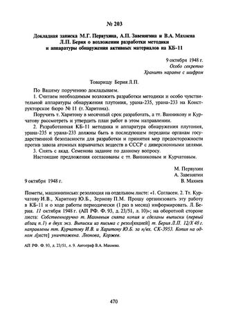 Докладная записка М.Г. Первухина, А.П. Завенягина и В.А. Махнева Л.П. Берия о возложении разработки методики и аппаратуры обнаружения активных материалов на КБ-11. 9 октября 1948 г.