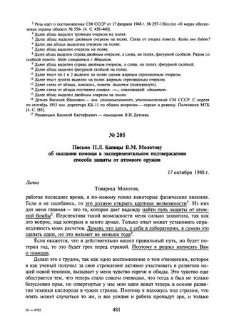Письмо П.Л. Капицы В.М. Молотову об оказании помощи в экспериментальном подтверждении способа защиты от атомного оружия. 17 октября 1948 г. // АП РФ. Ф. 3, оп. 47, д. 36, л. 104. Копия.