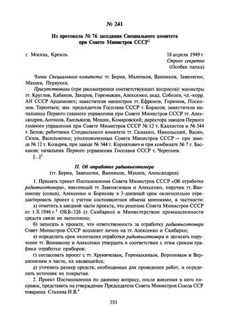 Из протокола № 76 заседания Специального комитета при Совете Министров СССР. 18 апреля 1949 г. // АП РФ. Ф. 93, д. 2/49, л. 68-77. Подлинник.