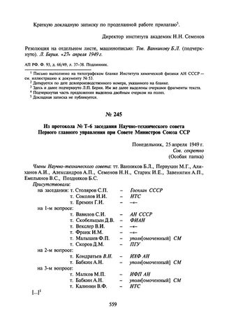 Из протокола № Т-6 заседания Научно-технического совета Первого главного управления при Совете Министров Союза ССР. 25 апреля 1949 г. // АП РФ. Ф. 93, д. 7/49, л. 297-421. Протокол и приложение № 1 — подлинники, приложение № 2 — заверенная копия.
