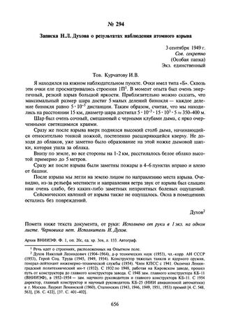 Записка Н.Л. Духова о результатах наблюдения атомного взрыва. 3 сентября 1949 г.