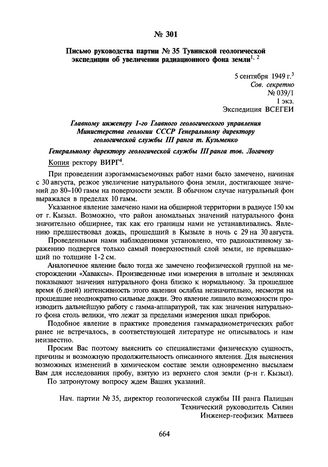 Письмо руководства партии № 35 Тувинской геологической экспедиции об увеличении радиационного фона земли. 5 сентября 1949 г.