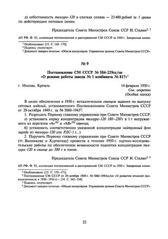 Постановление СМ СССР № 584-229сс/оп «О режиме работы завода № 1 комбината № 817». 14 февраля 1950 г. // АП РФ. Ф. 93, коллекция постановлений и распоряжений СМ СССР за 1950 г. Заверенная копия.
