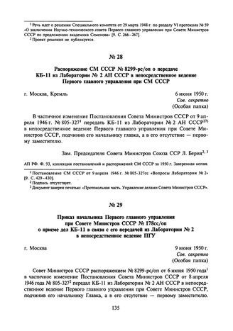 Приказ начальника Первого главного управления при Совете Министров СССР № 178сс/оп о приеме дел КБ-11 в связи с его передачей из Лаборатории № 2 в непосредственное ведение ПГУ. 9 июня 1950 г. // Архив Росатома. Ф. 24, оп. 4, д. 101, л. 73. Подлинник.