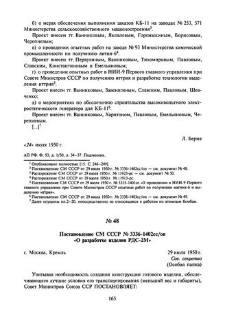 Постановление СМ СССР № 3336-1402сс/оп «О разработке изделия РДС-2М». 29 июля 1950 г. // АП РФ. Ф. 93, коллекция постановлений и распоряжений СМ СССР за 1950 г. Заверенная копия.