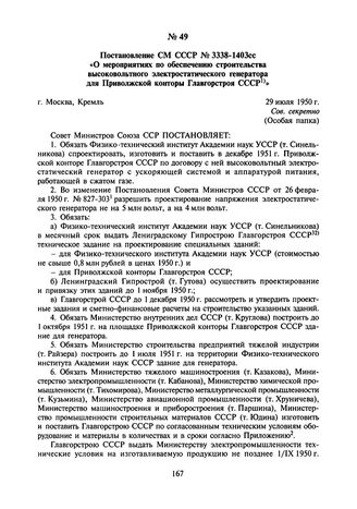 Постановление СМ СССР № 3338- 1403сс «О мероприятиях по обеспечению строительства высоковольтного электростатического генератора для Приволжской конторы Главгорстроя СССР». 29 июля 1950 г.