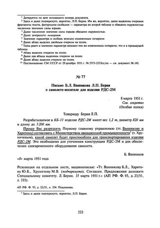 Письмо Б.Л. Ванникова Л.П. Берия о самолете-носителе для изделия РДС-2М. 8 марта 1951 г.