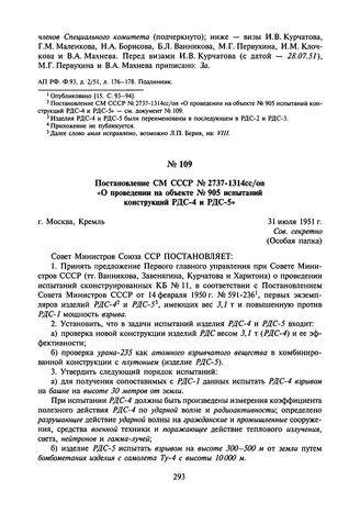 Постановление СМ СССР № 2737-1314сс/оп «О проведении на объекте № 905 испытаний конструкций РДС-4 и РДС-5». 31 июля 1951 г.