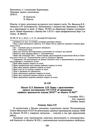 Письмо Б.Л. Ванникова Л.П. Берия с представлением проекта постановления СМ СССР об организации серийного производства изделия 501М на объекте № 814. 7 сентября 1951 г.