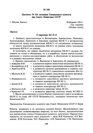 Протокол № 124 заседания Специального комитета при Совете Министров СССР. 26 февраля 1952 г. // АП РФ. Ф. 93, д. 2/52, л. 7-8. Подлинник.