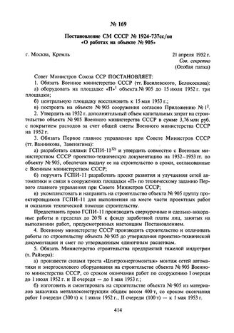 Постановление СМ СССР № 1924-737сс/оп «О работах на объекте № 905». 21 апреля 1952 г. // АП РФ. Ф. 93, коллекция постановлений и распоряжений СМ СССР за 1952 г. Заверенная копия.
