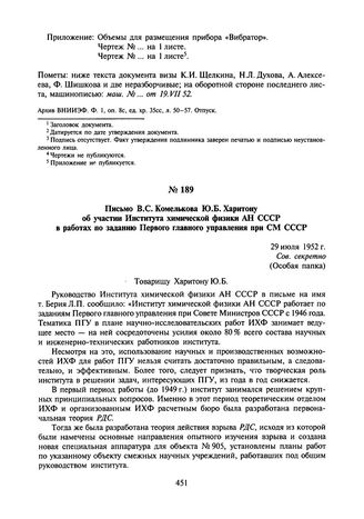 Письмо В.С. Комелькова Ю.Б. Харитону об участии Института химической физики АН СССР в работах по заданию Первого главного управления при СМ СССР. 29 июля 1952 г. // Архив ВНИИЭФ. Ф. 1, оп. 2с, ед. хр. 43сс, л. 90-94. Подлинник.