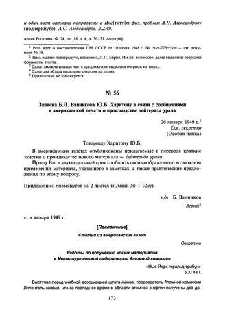 Записка Б.Л. Ванникова Ю.Б. Харитону в связи с сообщениями в американской печати о производстве дейтерида урана. 26 января 1949 г. // Архив Росатома. Ф. 24. д. 16343, л. 10-12. Записка — заверенная копия, приложение — перевод с английского.