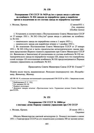 Распоряжение СМ СССР № 10004-рс о поставке лития Первому главному управлению при СМ СССР. 20 июня 1951 г. // АП РФ. Ф. 93, коллекция постановлений и распоряжений СМ СССР за 1951 г. Заверенная копия.