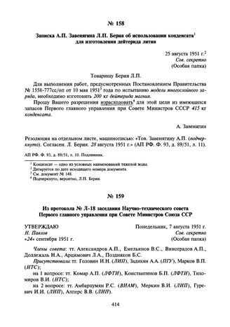 Из протокола № Л-18 заседания Научно-технического совета Первого главного управления при Совете Министров Союза ССР. 7 августа 1951 г.