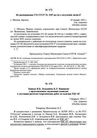 Из распоряжения СМ СССР № 1187-рс/оп о получении лития-6. 19 января 1952 г. // АП РФ. Ф. 93, коллекция постановлений и распоряжений СМ СССР за 1952 г. Заверенная копия.