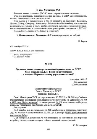 Докладная записка министра химической промышленности СССР С.М. Тихомирова Л.П. Берия об изготовлении и поставке Первому главному управлению лития-6. 3 декабря 1952 г. // АП РФ. Ф. 93, д. 247/52, л. 44. Подлинник.