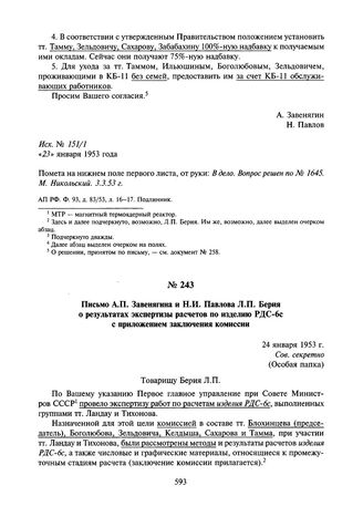 Письмо А.П. Завенягина и Н.И. Павлова Л.П. Берия о результатах экспертизы расчетов по изделию РДС-6с с приложением заключения комиссии. 24 января 1953 г.
