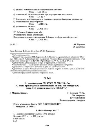 Из постановления СМ СССР № 398-193сс/оп «О плане производства и себестоимости на 1953 год теллура-120, олова-115, иттрия и продукта 120.360. 11 февраля 1953 г.
