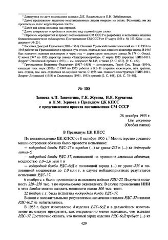 Записка А.П. Завенягина, Г.К. Жукова, И.В. Курчатова и П.М. Зернова в Президиум ЦК КПСС с представлением проекта постановления СМ СССР. 28 декабря 1955 г. // Архив Росатома. Ф. 24, оп. 18, д. 29, л. 149-156. Заверенная копия.