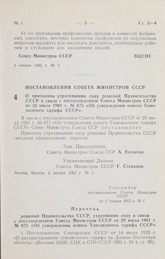 Постановление Совета Министров СССР. О признании утратившими силу решений Правительства СССР в связи с постановлением Совета Министров СССР от 28 июля 1961 г. № 671 «Об утверждении нового Таможенного тарифа СССР». 2 января 1962 г. № 1