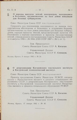Постановление Совета Министров СССР. О порядке выплаты пенсий пенсионерам, находящимся в больницах, организованных на базе домов инвалидов для больных туберкулезом. 9 января 1962 г. № 24