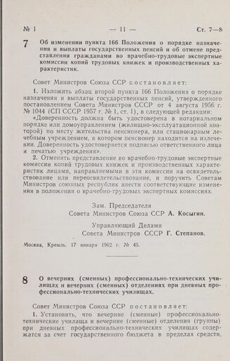 Постановление Совета Министров СССР. О вечерних (сменных) профессионально-технических училищах и вечерних (сменных) отделениях при дневных профессионально-технических училищах. 22 января 1962 г. № 64